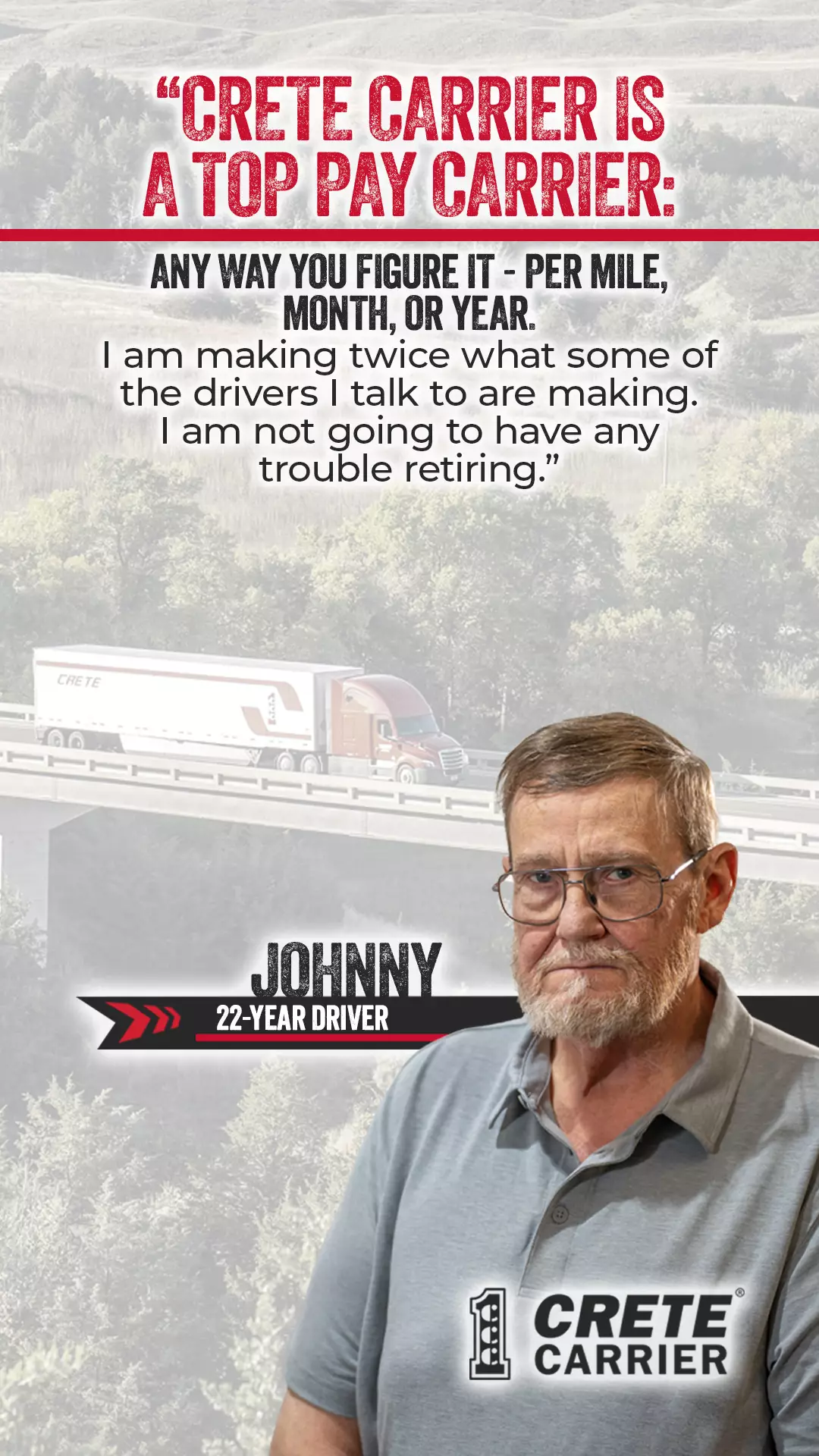 For over 50 years, Crete Carrier has grown to one of the nation’s largest, privately held trucking companies. Along with sister company, Shaffer Trucking, and wholly-owned subsidiary, Hunt Transportation, Crete Carrier Corporation operates as a truckload and flatbed carrier for virtually any commodity. At Crete Carrier, we are dedicated to our drivers. As a result, we have one of the lowest turnover rates in the industry, with drivers staying with us three times longer than they do with our competition. We take pride in our relationship with our drivers. Our professional drivers are among the best on the highways, meeting standards far exceeding those required by the U.S. Department of Transportation.